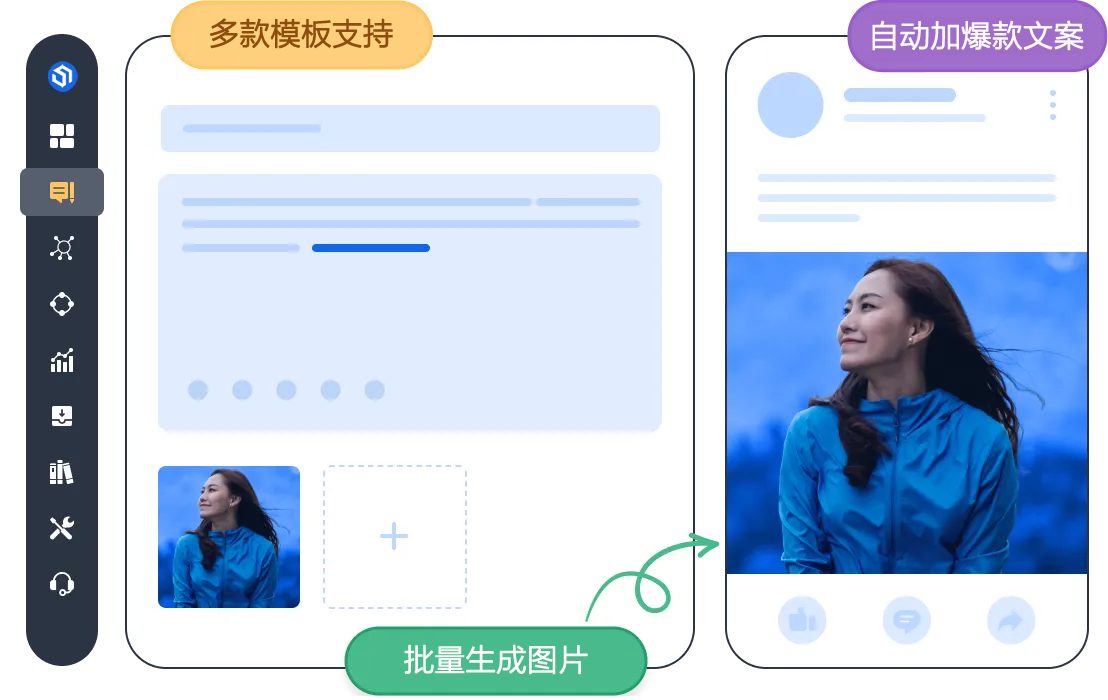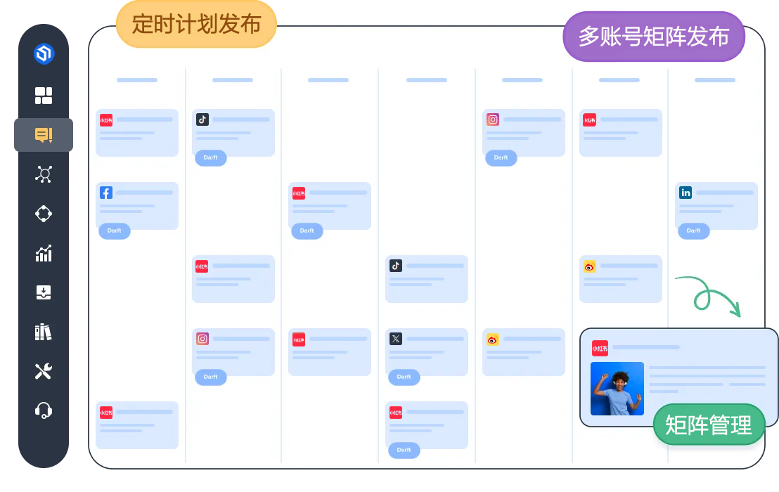 • 海内外社媒支持,包括小红书 微博 头条 抖音图文 ins facebook X linkdin