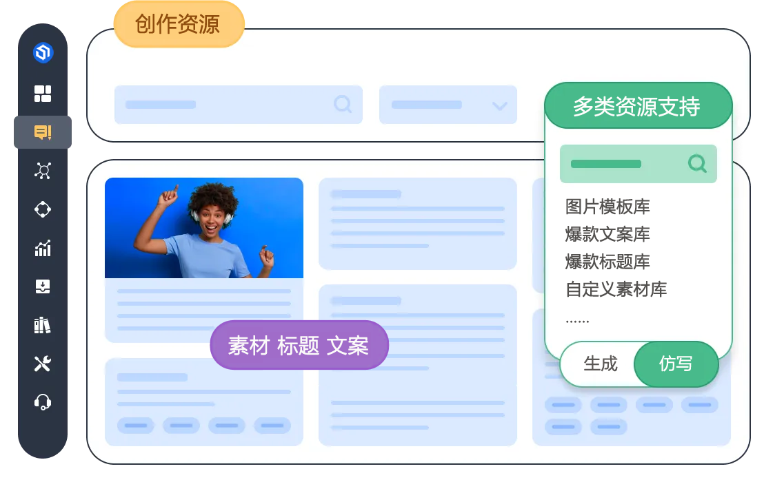 系统内置大量优质标题、文案、图片模板和各种创作灵感库,可以让您快速创作出高质量图文内容